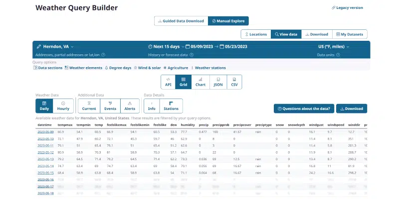 The Visual Crossing Query Builder tool enables the full power of the Visual Crossing Weather API to be used in a convenient web-based interface. With it, you can create custom weather queries including historical data searches, forecasts, and ultra-long range forecasts based on climate normals. You have full control over which weather stations are searched, which weather sources are considered, and which weather elements are returned. You can then review the result data on an interactive grid, download the data for further analysis, or ask the interface to create a query URL that can be used to replicate your exact query inside any code, script, or analysis tool. You can even schedule your query so that the data is refreshed automatically at a specific time of day.