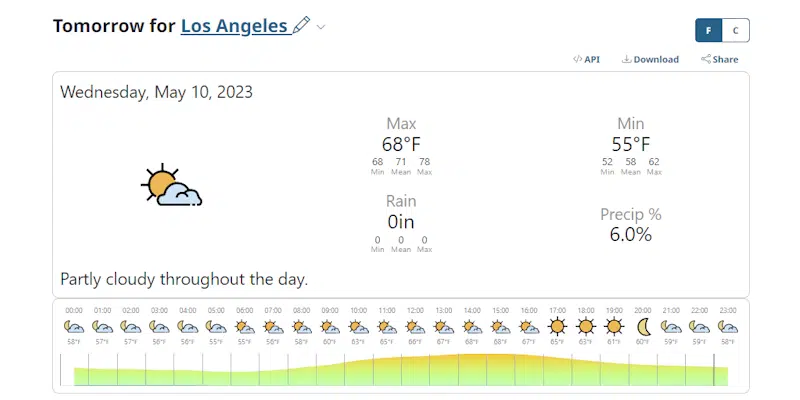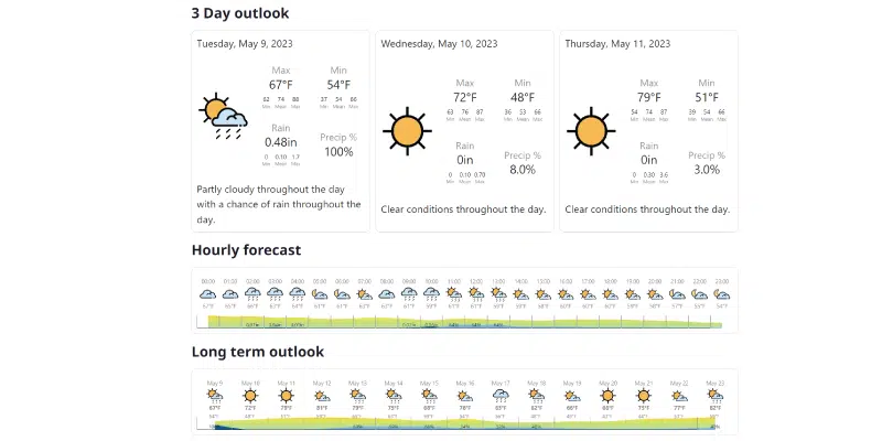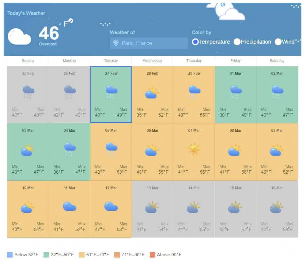 The Weather Calendar provides an overview of the forecast in a calendar format to aid in planning and the understanding of upcoming conditions. It’s interactive color thresholding makes it easy to see at a glance how days will be affected by temperature, precipitation, and wind. The “bookend” areas in gray represent days outside of the traditional 15-day model-based forecast. For days before the current day, history data is shown while for days after the 15-day forecast, statistical forecasts are used. This shows the power of the Visual Crossing Timeline API to deliver weather data from a range of sources in response to a single query.