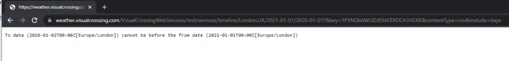 If your Weather API query doesn’t work, the easiest way to check whether there’s a problem with the query or parameters is to paste the query into a browser. This will return the query results if you query is correct or an error if there is a problem.