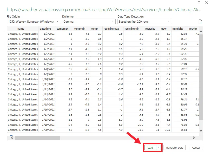 At this point, we can choose to do more advance ETL operations such as manipulating data or data types. You can also choose to load this table into Excel items such as Pivot Tables. For our exercise, we will simply click “Load” which will load our table of weather data into a standard Excel table in a new sheet.