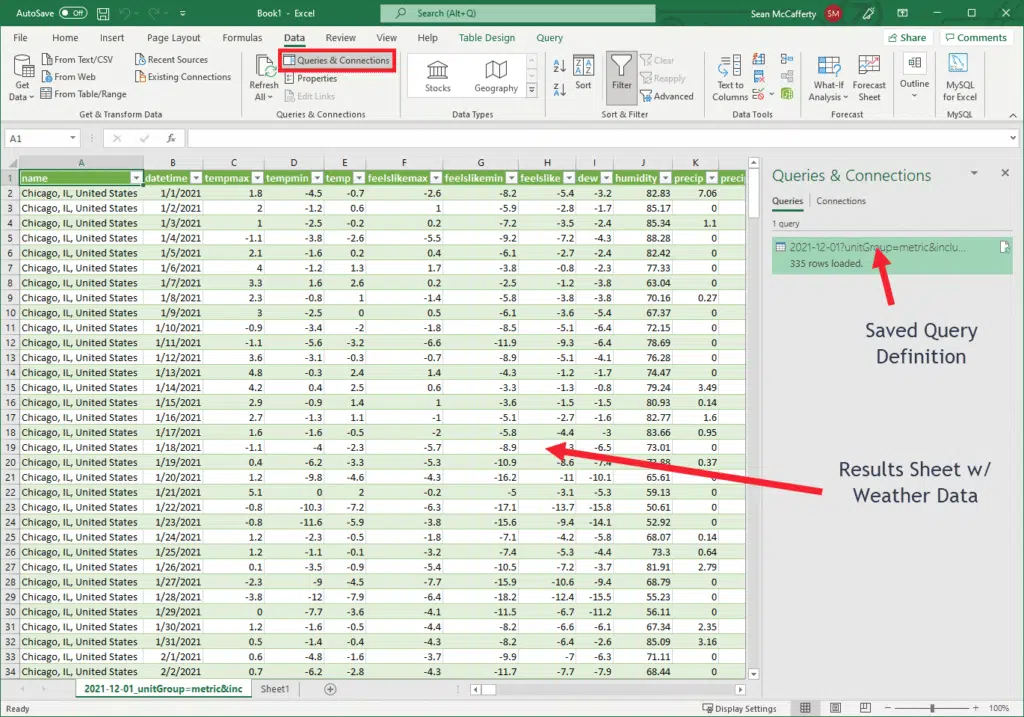 One of the powerful features of the Visual Crossing Weather Service is the ability to query data via a Web Service or URL. This benefits not only coders but rather can be utilized to import data into most Business Intelligence Systems including Excel. When you include your data into Excel, you can refresh the data or refer to it from other Sheets to pull out specific time periods or weather variables as needed. In this document, we will show you the basic steps required in loading this data.