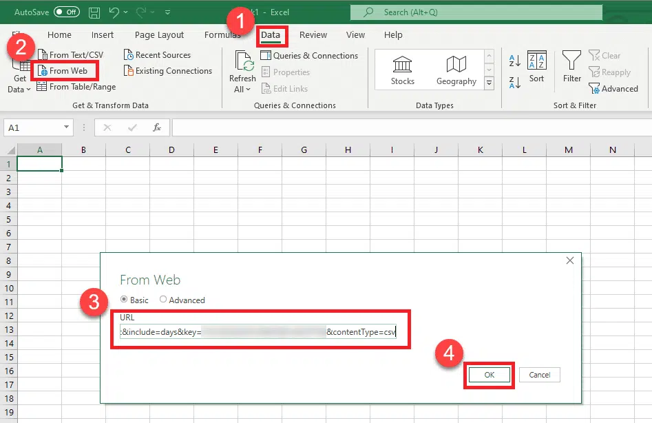 First navigate to the “Data” menu in the Excel ribbon. Choose the option “From Web”, which tells Excel that it would like to create a PowerQuery loading script from a URL Query string. Paste our string from the Query Builder into the “URL” text area and click “OK”.