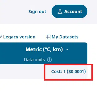 Cost: In Query Builder it will show you the “Metered” cost for the data you are about to download. The metered cost is currently $.0001 per result row of weather data. Limiting columns or other features do not affect the cost. Also, note that our single, 15-day forecast counts as 1 row of result data even though there are 15 rows.