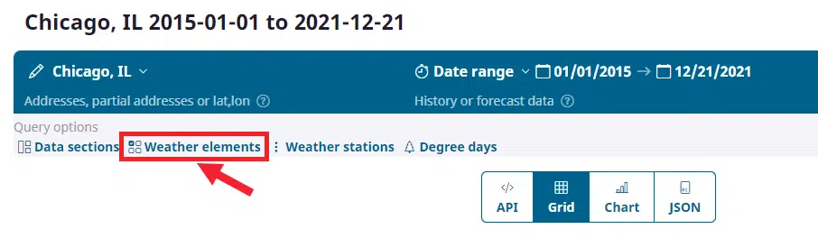 Element Choice: If you select “Weather Elements” you can choose a specific set of weather elements to bring back in your dataset:
