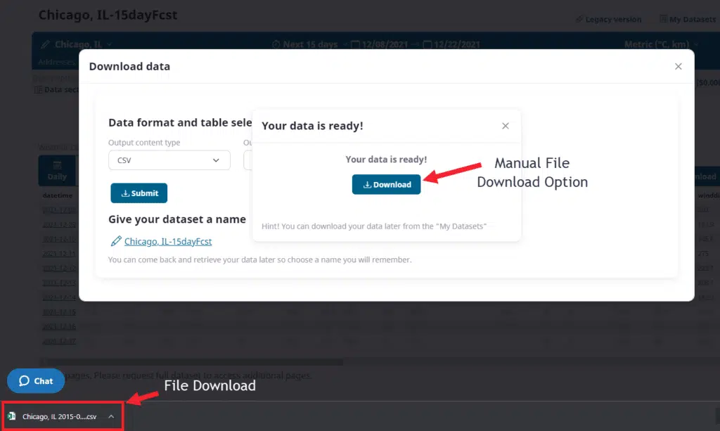 Now we can click our “Submit” button and you will have your CSV weather results automatically downloaded via your browser as a file.