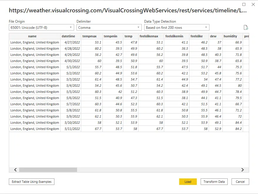 When we click on the Load button, Power BI will fetch the entire forecast dataset and make it available for analysis. Once loaded, we can immediately begin using our weather data in our Power BI analyses. We can not only analyze the data directly, we can correlate weather with existing business data to make and adjust plans such as staffing levels, supply levels, optimal operating hours, and more.