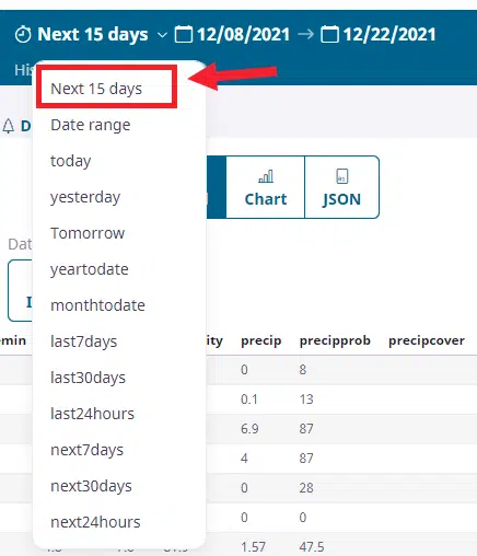 By keeping our date options as “Next 15 days” we are telling Query Builder that we want to see a full 15-day forecast for our given location. No other date selections are necessary. However, if we wanted only certain dates in the future we can choose “Date range” and manually select our own forecast start and end date. Alternately, we could use the Time Period control to select a dynamic period options such as “tomorrow,” “next7days,” or even “nextweekend.”