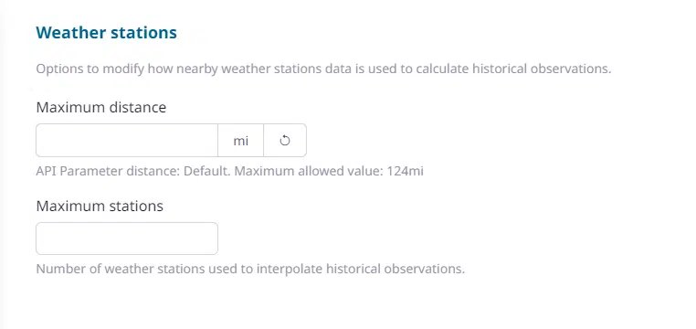 As we can see in our example, there are no weather stations found near the above location. By default, queries will search for weather stations up to 50 kilometers or 50 miles from the requested location (based on your chosen units system). This value can be extended to up to 200km (about 125 miles) using the ‘maximum distance’ setting. This setting is available in the query builder or the API request. To set this in the query builder, click on the Query Options->Weather Stations link at the top of the page: