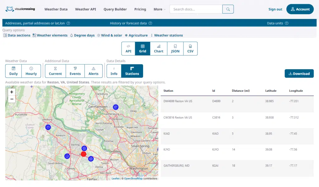 For example, if I request the historical weather data for the town of Reston in Virginia, USA. We can display the available weather stations on the data set. Doing this results in the following list of weather stations: