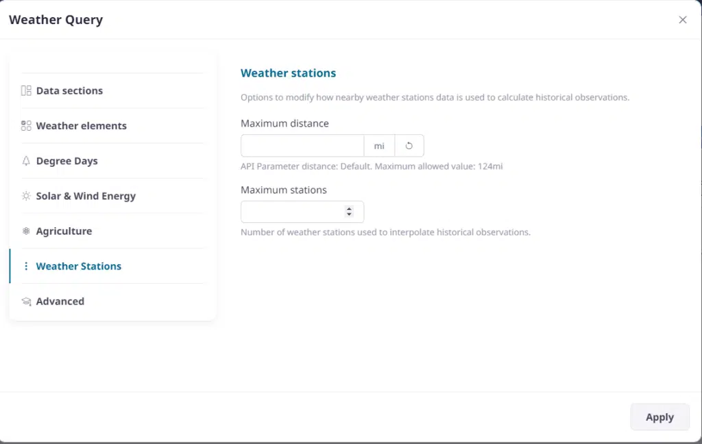 If you need finer control over the weather stations that are used, the “Maximum number of weather stations” and “Maximum distance to stations” settings allow you to control maximum number of weather stations to consider: