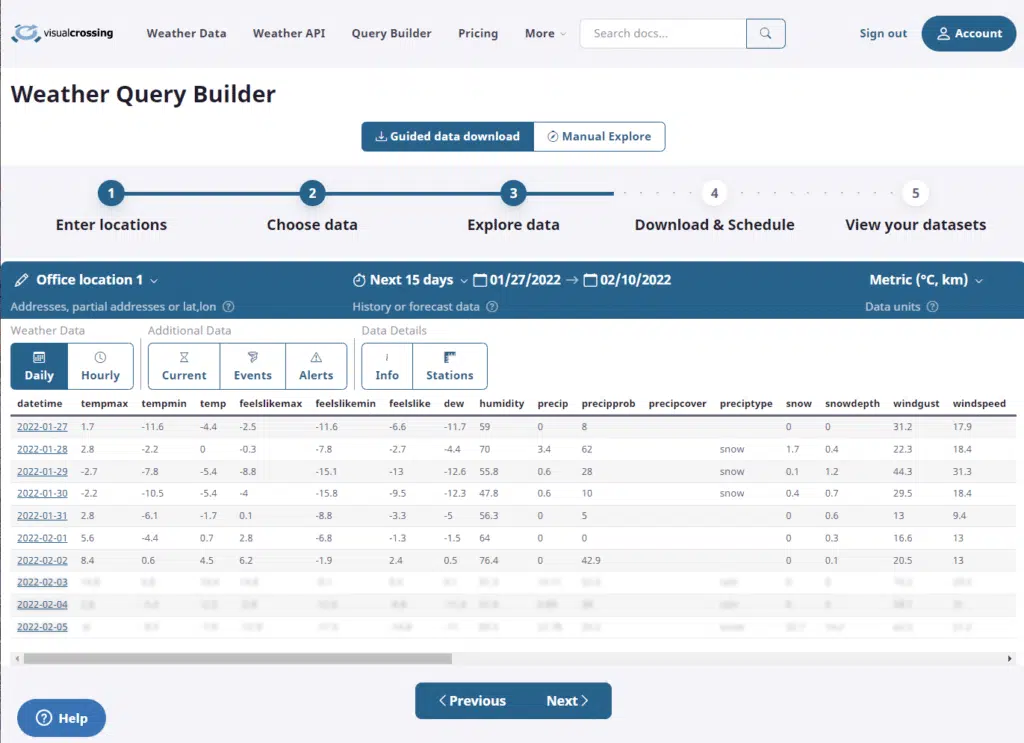 Downloading weather data for multiple locations in CSV, Excel, or JSON format is easy using our Query Builder page. In this guide, we will walk through the process of uploading a file of location or pasting in CSV data from the clipboard, composing a weather query, previewing weather data for these locations, and then downloading the result data for that query to our local computer for later analysis. To make this process extremely simple we will use the Guided Data Download functionality that walks us through the process step by step.