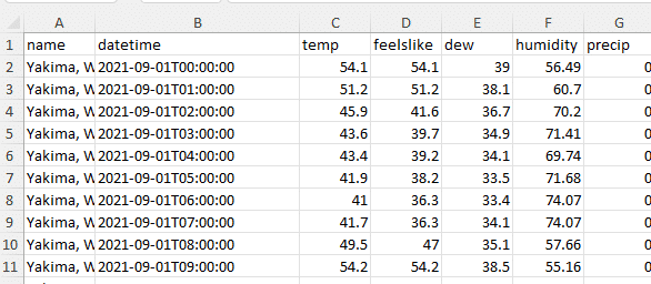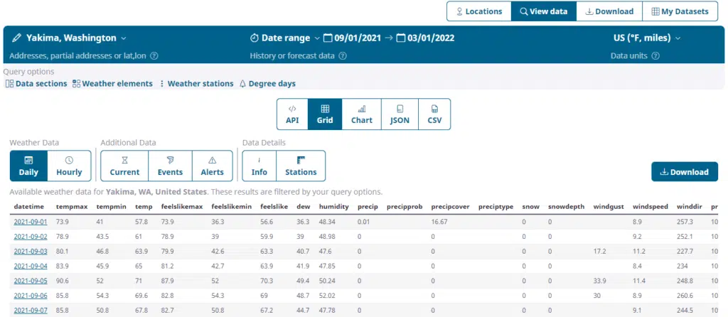 In this example, we are going to use the page to download the hourly temperature for Yakima, Washington, USA, for the fall and winter from September 1st to March 1st. If this is your first time building a dataset using the Visual Crossing Query Builder, you can use the following article as a guide.