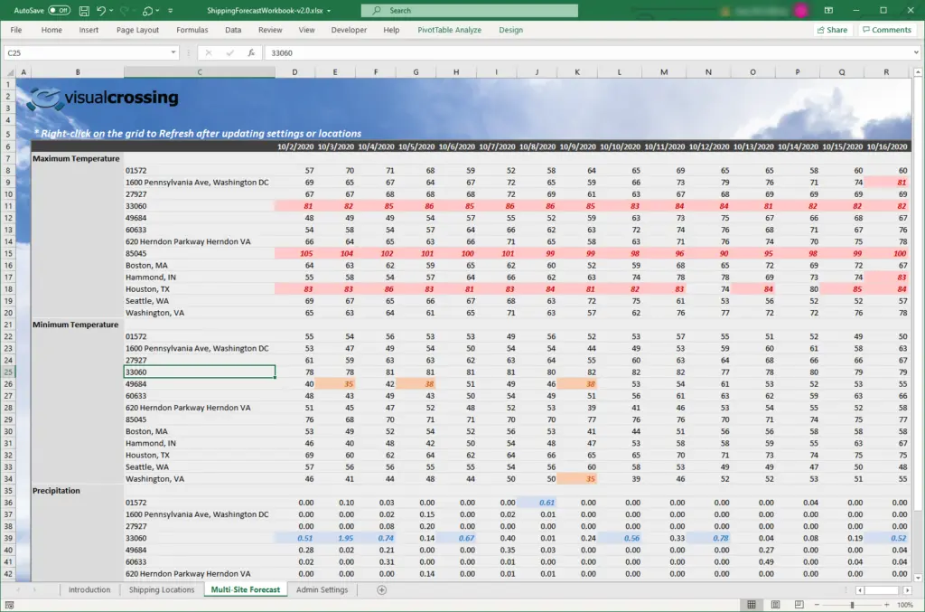 The final step toward your first query is to click on the ‘Data’ menu in Excel and select ‘Refresh All’ from the Excel ribbon bar. This will submit a Forecast Query (using Power Query built into Excel) to the Visual Crossing Weather Service for all of your locations and return the forecast results into an Excel Pivot Table as seen below: