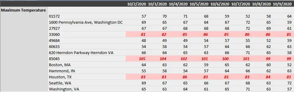 In our example above we can clearly see that the zip code for Phoenix, Arizona is going to have temperatures in excess of 100 F and shipping to this area will require a schedule change or alternate shipping method such as dry ice. Being able to easily detect and highlight temperature concerns in a list of over 1000 locations is a powerful feature!