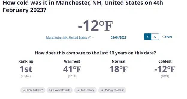 The state of New Hampshire experienced dangerous subzero temperatures, causing many communities to endure low temperatures. The wind chill caused the temperature to drop to -15°F (-26°C) when kids were released to go home on Thursday, according to the Manchester School District in New Hampshire.