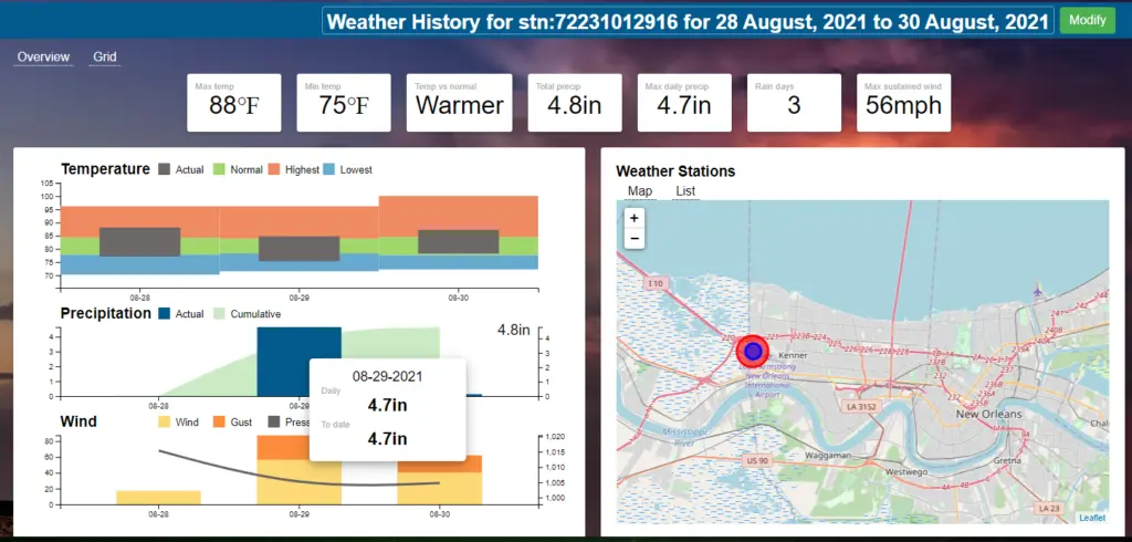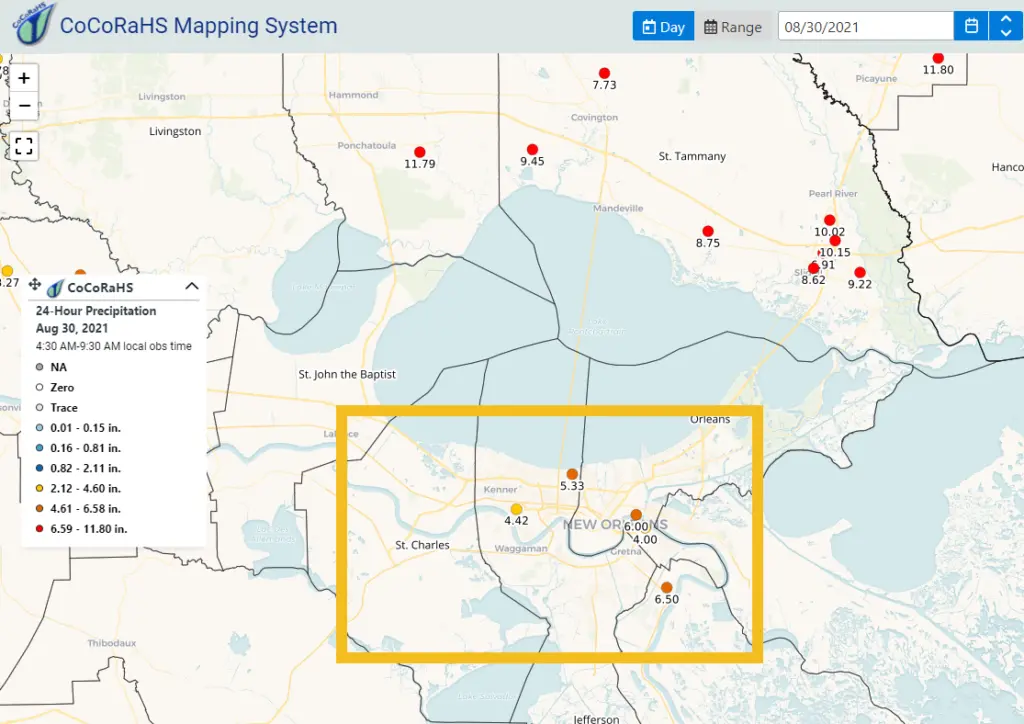 Our report at this one station states that 4.7″ of rain fell on August 29th, 2021 when Ida came ashore. If we let the system include data from surrounding stations we average out the New Orleans area weather to about 5.7″ for that day. When you are not close to a station, the system will use multiple stations to interpolate your specific rain value for a custom geographic point such as an address, city, zip code or lat/long coordinate.