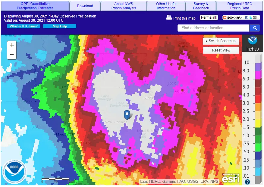 Given the differences of radar it can do a good job of showing more granular pockets of rainfall that can go unnoticed by major weather stations. It is possible that it could find the pocket of 17″ rain west of New Orleans. Here is the map of rainfall for Hurricane Ida in New Orleans on that day: