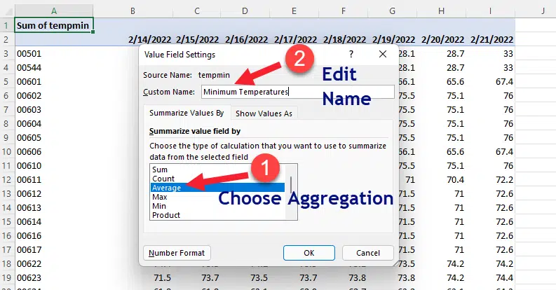 One key item we need to do is to select the ‘Sum of tempmin’ field in the ‘Values’ area to define the aggregation of our min temperature value and name it.