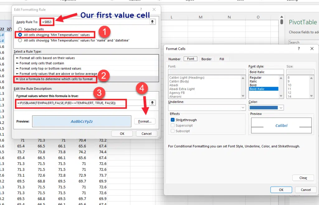 It is a bit complex but just note that the rule will color the cell in our data when values are less than or equal to our value set in the ‘TEMPALERT’ area.