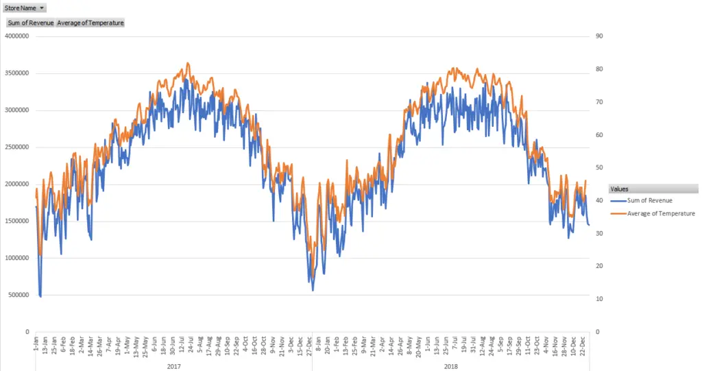 Now that the business data and weather data have been joined, we are ready to compare them. One of the easiest ways to do this is via dashboard visualizations. To get started every BI tool can make a graph comparing business data metrics with weather metrics. You can use this technique to step through the weather variables and business variables to see how they correlate visually. Below is an example of a simple, visual correlation graph in Excel.