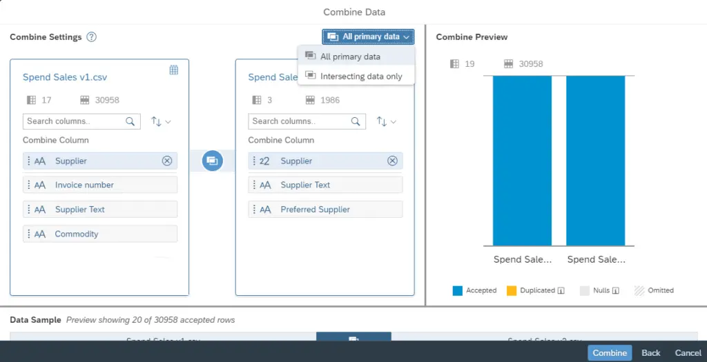 More sophisticated business intelligence tools often have a more clever process of combining business data with external data. Some common terms used are “data wrangling,” “data joining,” “data blending,” or “combining data sources.” However, all of these terms typically lead to a wizard that will guide you through the joining process. Consult the documentation for your favorite BI tool to find the right option. Below are some example dialogs from common BI platforms.