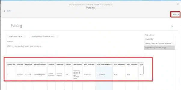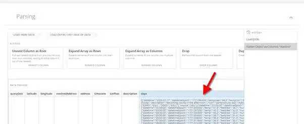 - Visual Crossing’s Timeline API usually nested data under days. You will likely need to select the days object to expand the daily weather rows into individual records in your Domo table.