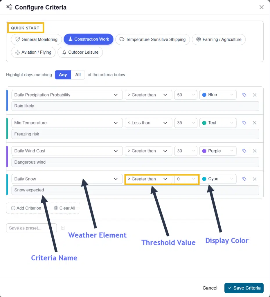| Criterion name | A custom label (e.g., “Freezing Risk”). |