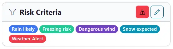 After filling your locations the second required step is for you to tell the dashboard what weather elements you wish to track and identify values at which those elements present a risk to your operation at those sites. Risk criteria are the weather rules that you enter to identify if whether a site is flagged based on its daily/hourly value as “at risk.” You can define as many criteria as you need, and each one is shown as a color-coded badge for easy identification that a threshold has been triggered.