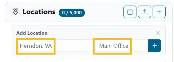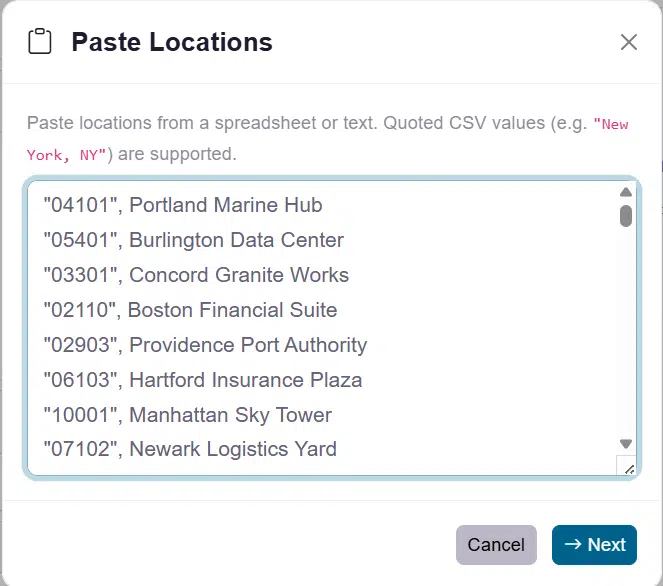 Most users will have dozens to thousands of locations and manual entry is not an option… One convenient option is cut/paste from your system clipboard. To activate this, click the ‘clipboard’ icon button to bulk-paste locations from your clipboard — the format must have one location per line. This is handy when copying a column from a spreadsheet. Note that you can comma separate the location and name to import both field settings in a single paste action. Here we are pasting in a list of 100 locations with both location data and names: