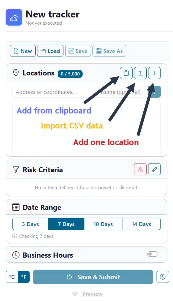 All weather queries at a minimum require the location for the weather and the date time components. In this tracker we will start by loading locations that we wish to monitor. The Locations card in the editor panel is where you build your list of sites. There are 3 methods to assist you: Manually add one location at a time, Paste in a list from another text source and loading from files such as a CSV file exported from Excel.