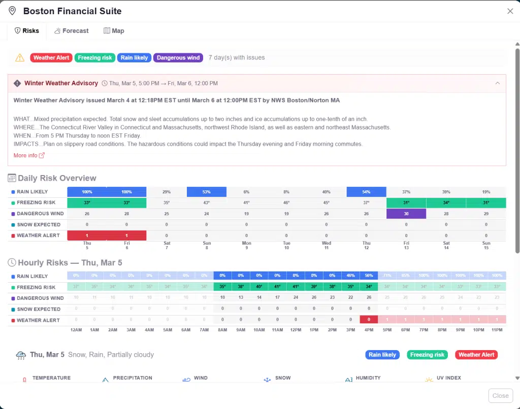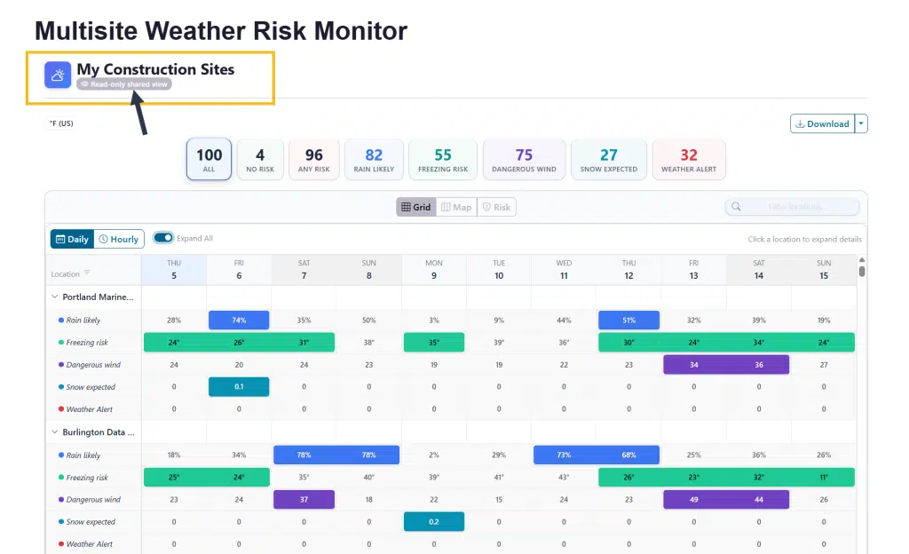 The Multi-Site Weather Risk Monitor lets you track weather risks across thousands of locations simultaneously. Define the weather conditions that matter to your operations — high winds, freezing temperatures, heavy rain, and more — then monitor and filter your entire network of sites on a single dashboard with daily and hourly detail.