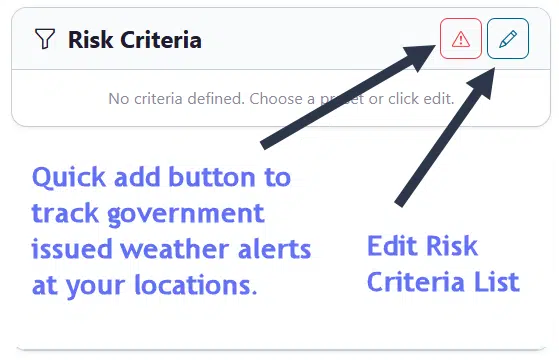On the main screen there are two buttons to get started. The first button with the ‘Alert’ icon will add government issue weather alerts automatically as a risk value that you will track for your locations. You can also add this inside of the editor. The ‘Edit’ icon will open the Risk Criteria editor where you can begin to add to your list of weather elements and values to track.