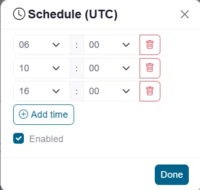 Note: Set up to 4 daily run times (UTC) for automated updates.