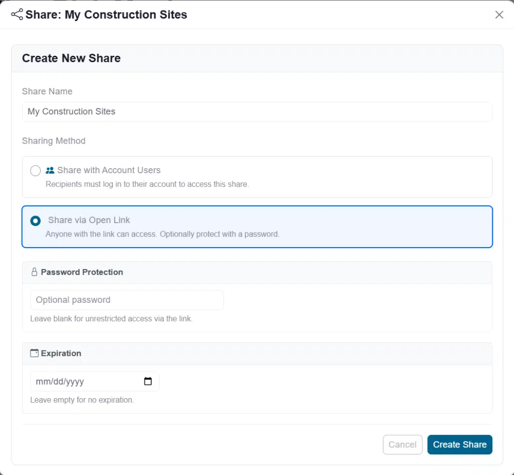 - Shared Open Links: Use these for field teams so they don’t need their own login to see daily status.