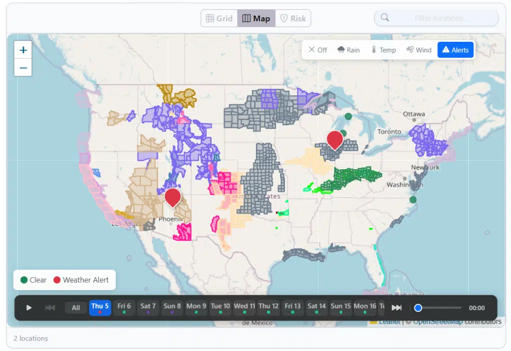 The main section is dedicated to giving you a calendar forecast view of all your locations with highlighted risks. There are several view modes that you may find useful while doing your analysis.