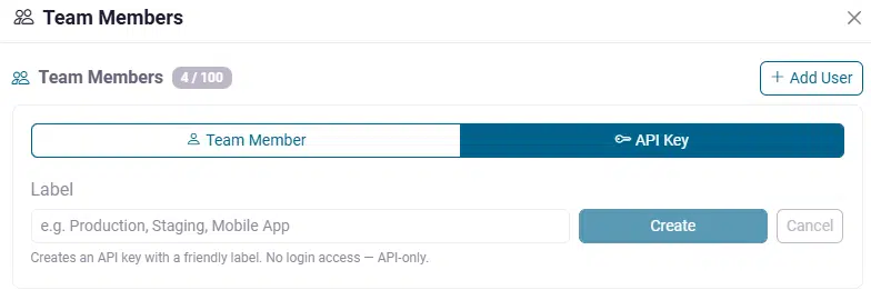 Team members are full user accounts with their own login credentials and API key.