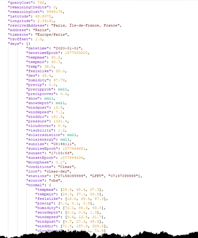 https://weather.visualcrossing.com/VisualCrossingWebServices/rest/services/timeline/Paris/2020-1-1/2020-2-1/?key=1234567890