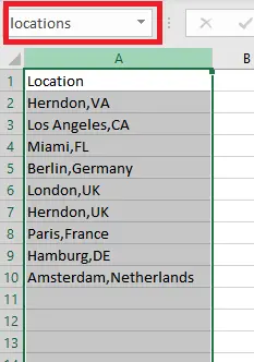 Now we create a range for a full Worksheet column to read the list of locations. We create a named range called ‘locations’: