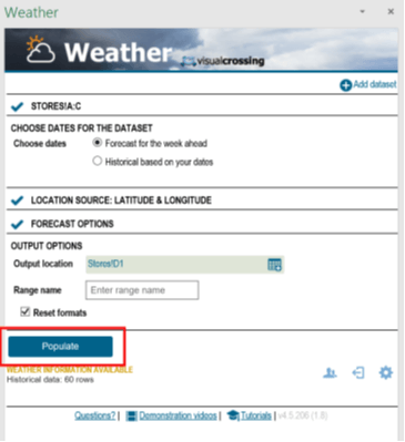Now that the data has been selected and options populated, you can click the Populate button at the bottom of the Weather panel. This will cause several new columns to be added to the right of the existing sheet data. These columns contain the weather at the specified locations (given by the latitude/longitude) and on the specified dates. You will see variables such as Temperature, Precipitation, and Wind speed. (Note that you can use the options on the Weather panel to change the output location if you wish.)