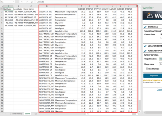 This will cause Visual Crossing Weather to populate the forecast data on the sheet to the right of the location data. (Note as before that you can easily change this output location via the panel settings.) This new data shows the forecast details for each location over the next week. Your sheet should now look approximately like the sheet below.