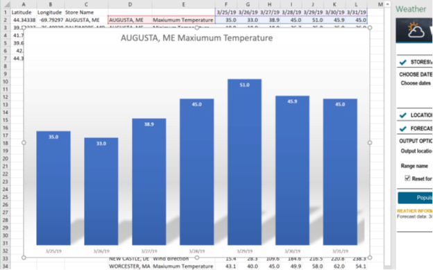 As with the historical weather data, this new forecast data is now available for you to analyze in Excel. For example, you can select the first two rows of forecast data and make a graph of the temperature in Augusta during the coming week.