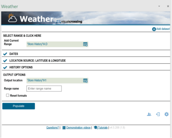 Clicking and installing the add-in will add a Weather entry to your Excel menu bar. Clicking on the Weather menu option will show the options below.