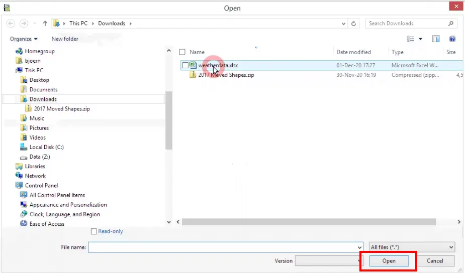 You can now open the just downloaded XLSX file in OpenOffice Calc by selecting the file in the ‘Open’ dialogue.