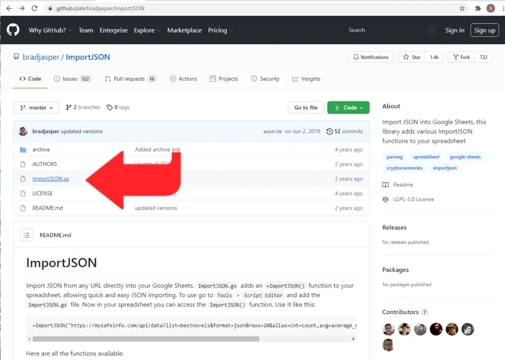 Clicking on the ImportJSON.gs file link will open the script’s source file in GitHub’s standard viewer. You can either select the file contents in that view or click on the “Raw” link in the upper right. If you click “Raw” the script file content alone will open in that tab, and you can just use your “select all” key combination to select the entire content.