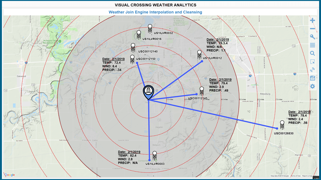 ANSWER (question 1) – There is no additional costs for the provided data and it is the same NWS data that all forecasters use to create their models so it the quality level is quite good. The source of the data is free, but the cleansing and interpolation are functions provided by the add-in. The image below shows how a single location could be matched to multiple weather stations nearby. It also emphasizes why interpolation and cleansing is necessary.