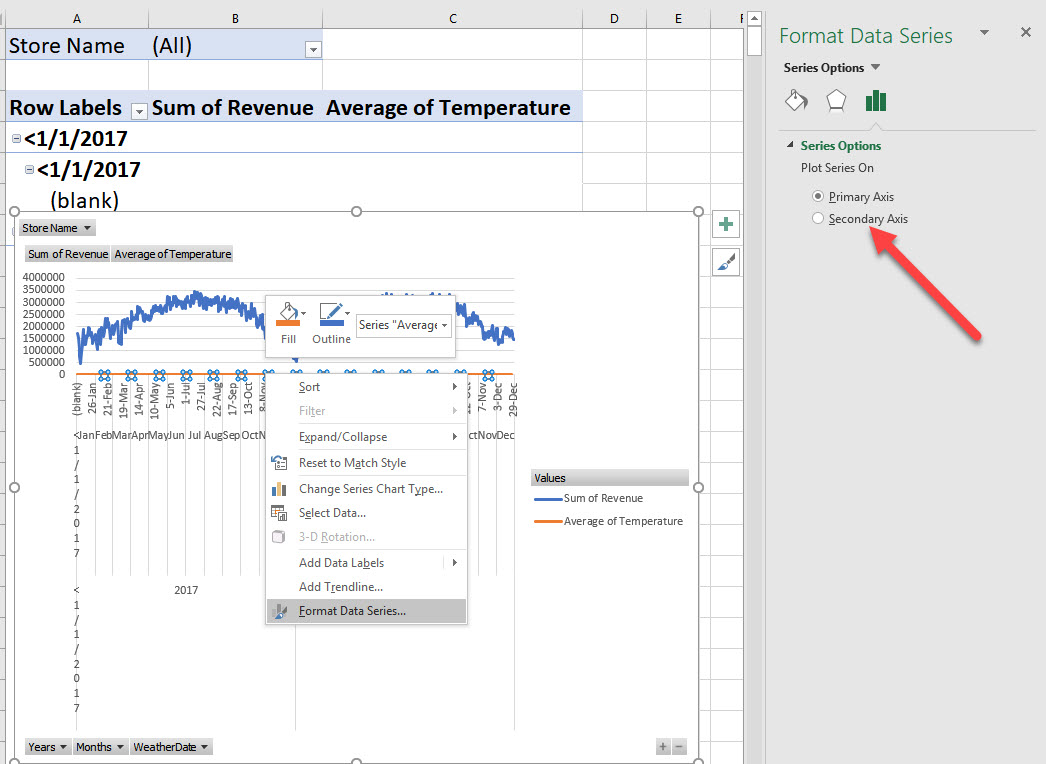 One additional adjustment to make the Temperature graph series to show on a secondary Y Axis. Revenue ranges in the 10s of thousands and temperatures are between -20 and 100 the scale of the single axis won’t help us. To do this, select and right-click on the Temperature line on the graph(orange in my case) and format the data series to use the secondary Y axis.