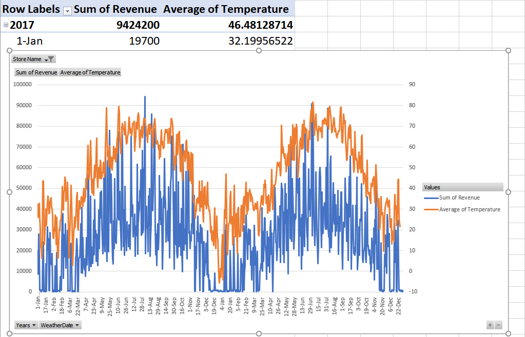 My pivot table is going to be quite simple. Date in the Rows, Revenue and Temperature in the Values and Stores in the Filter section. I chose to filter on each location because the weather in these locations can be very different and customers can respond very differently to it.