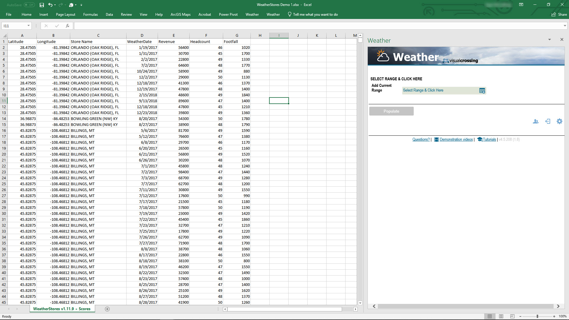 ANSWER (question 3) – The data is automatically put into a column that matches my locations and dates as expected. 50,000 rows took me about 4 minutes to populate. I found that I could also put the data on another sheet or area of my worksheet and reference it as a range of data.