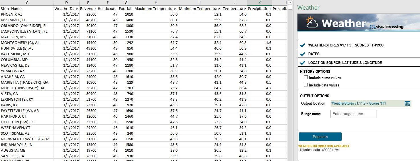 By clicking on the Populate button, the Weather add-in will start joining the data. See below how it has added the weather for every date for every location.