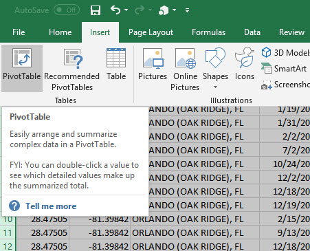 To start with, I find the best analysis is done in a pivot table. Especially when working with dates and graphs, I find that pivot tables will correctly aggregate the data for each day rather than graphing 12 points for each day. I’ll select my extended dataset with weather and insert a PivotTable.